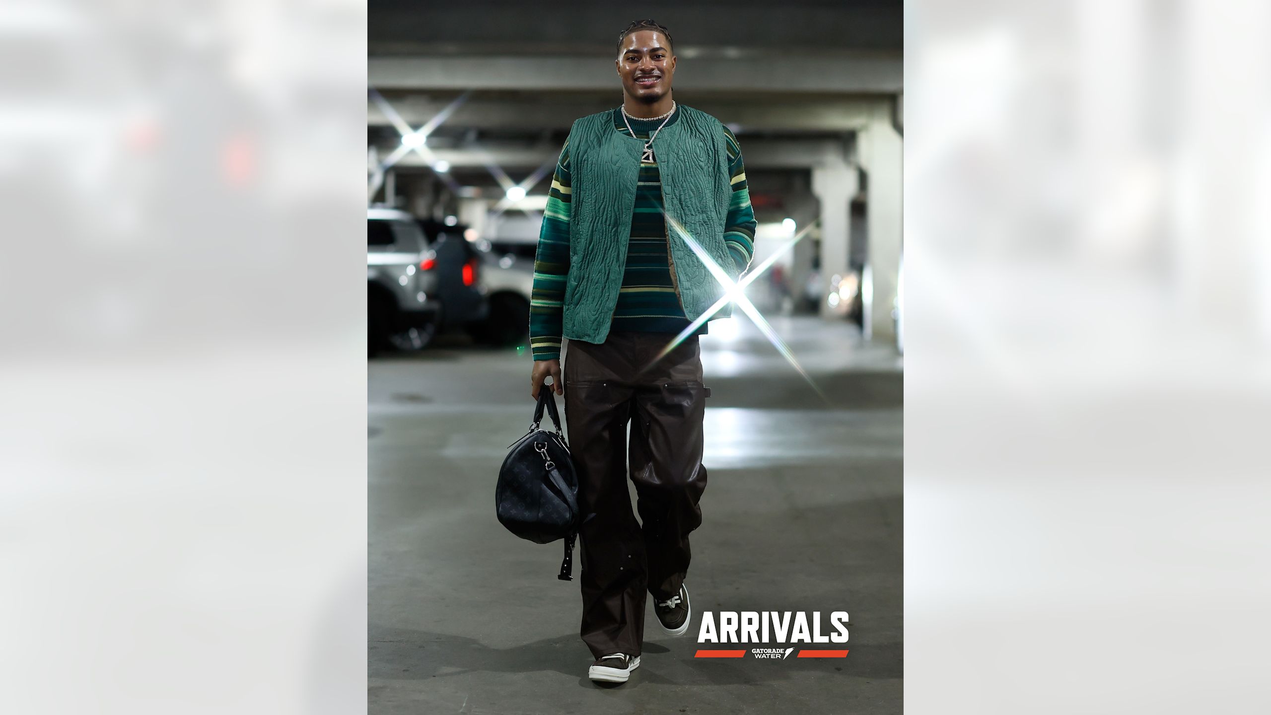 Thursday Night Football is a perfect time to put on a show, and Jones came through with a Deion Sanders in 2025 vibe, courtesy of this ROUGH all-leather racing jacket and pants set.